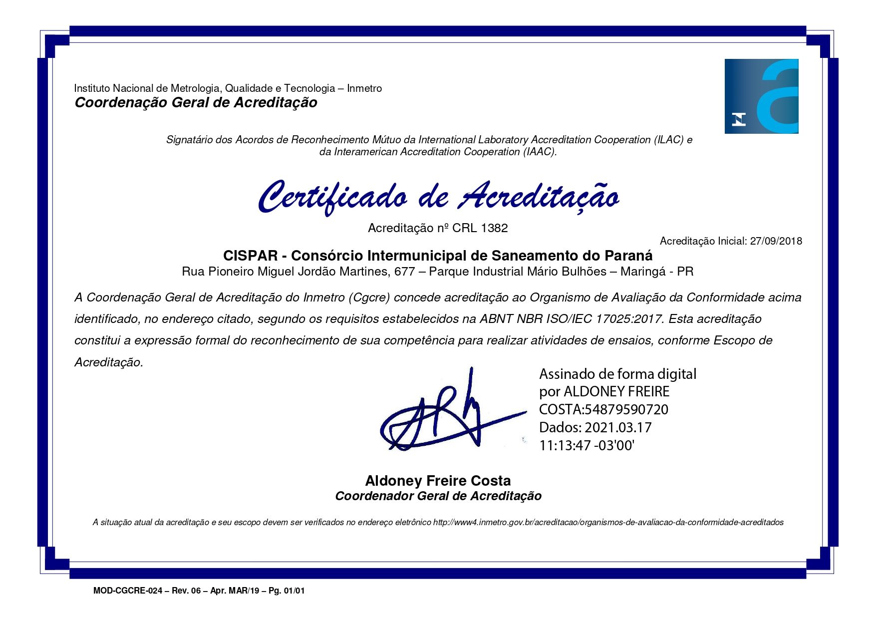 O Laboratório Cispar é acreditado pela Coordenação Geral de Acreditação do Inmetro para Ensaios ABNT NBR ISO/ICE 17025 sob número CRL 1382.